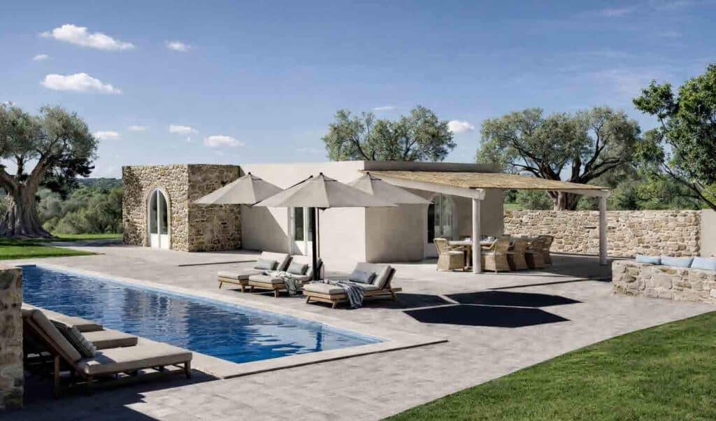 Nonostante gli ampi spazi esterni privi di separazioni funzionali, la privacy è consentita dall’unico muro perimetrale che protegge in modo discreto da sguardi estranei anche l’area della piscina pur senza essere visivamente prevalente e che racchiude anche un’area appartata con alcune docce esterne.